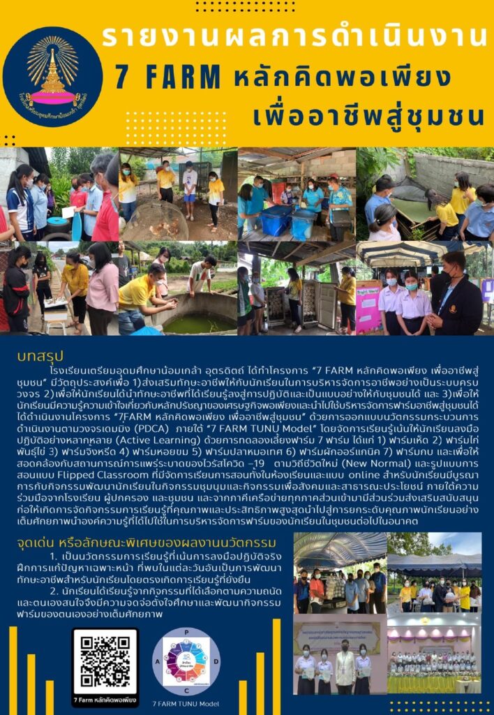 โรงเรียนเตรียมอุดมศึกษาน้อมเกล้า อุตรดิตถ์ ได้ดำเนินการจัดทำโครงการ “7 FARM หลักคิดพอเพียง เพื่ออาชีพสู่ชุมชน” มีวัตถุประสงค์เพื่อ 1)ส่งเสริมทักษะอาชีพให้กับนักเรียนในการบริหารจัดการอาชีพอย่างเป็นระบบครบวงจร 2)เพื่อให้นักเรียนได้นำทักษะอาชีพที่ได้เรียนรู้ลงสู่การปฏิบัติและเป็นแบบอย่างให้กับชุมชนได้ และ 3)เพื่อให้นักเรียนมีความรู้ความเข้าใจเกี่ยวกับหลักปรัชญาของเศรษฐกิจพอเพียงและนำไปใช้บริหารจัดการฟาร์มอาชีพสู่ชุมชนได้ ได้ดำเนินงานโครงการซึ่งทางโรงเรียนได้ดำเนินการแล้วเสร็จ สำหรับผู้ที่สนใจสามารถเข้าศึกษาดูงานแนวทางการดำเนินงานและฟาร์มตัวอย่างได้ในวันเวลาราชการสามารถดูรายละเอียดการดำเนินการได้จาก เว็บไซต์ “7 Farm หลักคิดพอเพียง เพื่ออาชีพสู่ชุมชน” จาก https://sites.google.com/tunu.ac.th/occupation
